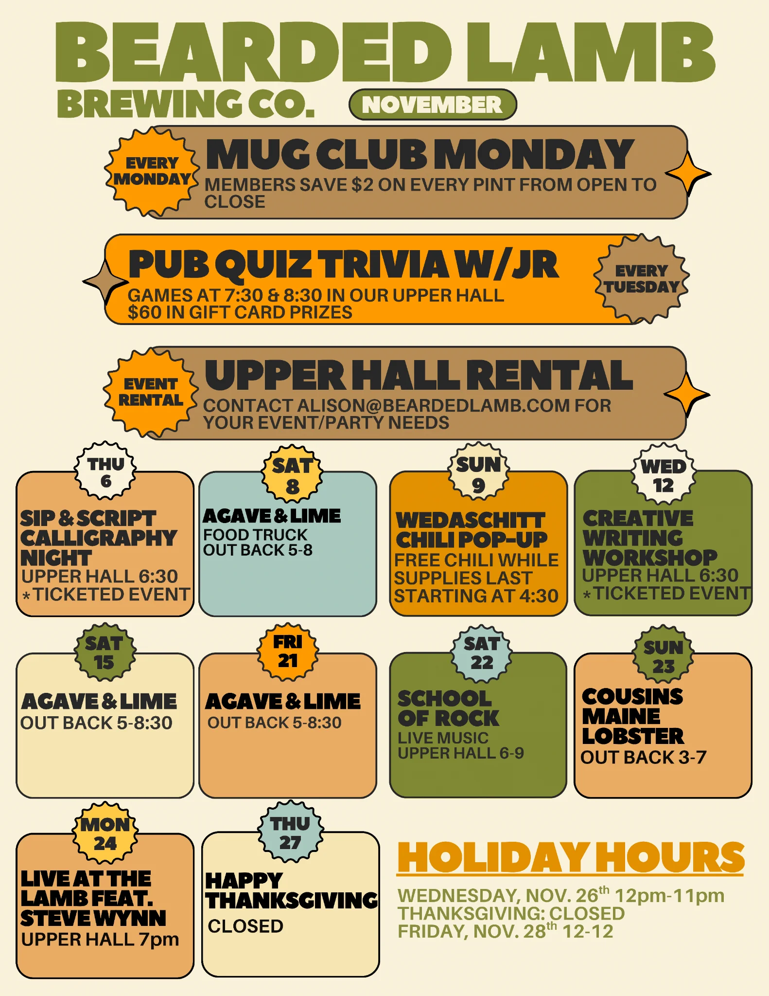 An old-style pub located in historic Old Village in Plymouth, MI, Bearded Lamb Brewing Company combines a quaint local feel with craft brews that can compete with the big boys. Whether you’re a dark beer kinda person or you prefer the haziest of IPAs, you’ll find something you LOVE here. Our craftsmen brew with local hops from the Michigan Hop Alliance and use only high quality ingredients in each creation. Come on by for pint, a game, a party, and a warming experience that you’ll only find at Bearded Lamb.